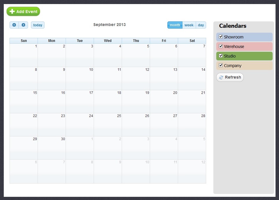 To add a new event you have to click on “Add Event” button or on any free date on the calendar.