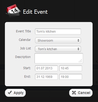 Before you are able to see your new event you'll have to fill in the empty fields with the necessary information and click on "Apply" button as it is shown in the picture below.