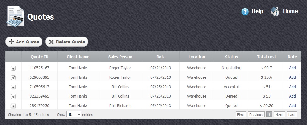 As soon as you add a new quote in the main module it will appear in the table of quotes. To sort data according to each column of the table, you just have to click on some column's name. If you click on the same column once again the sort direction will be changed.