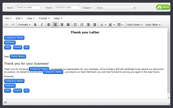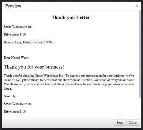 After it is done and the template is saved it can be used in a corresponding module. In the picture below an axample of a letter that is often sent to clients for example by email. Here is how your document will look like in a preview window before sending or printing.