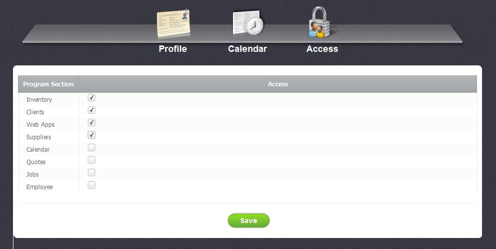 In this menu you are able to give or restrict acess to such sections: Inventory, Clients, Web Apps, Suppliers, Calendar, Quotes, Jobs, Emploees.