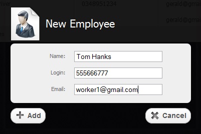 When you click on "Add Employee" button, opens a window where you should fill in the empty fields with the corresponding data and after that press "Add" button as it is shown in the picture below.
