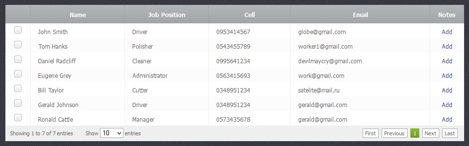 As soon as you add a new employee he will appear in the table of employees. To sort data according to each column of the table, you just have to click on some column's name. If you click on the same column once again the sort direction will be changed.