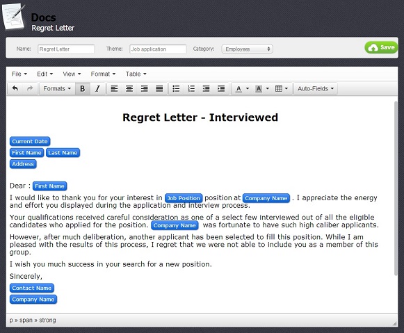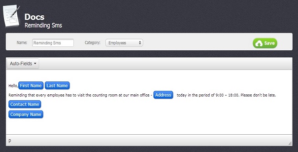 Use help section of the Docs module to get detailed information about how to add templates of messages and edit them before sending. Here we give an example of how such a template can look like: