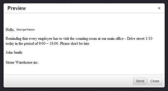 opposite the employee you wish to send text message to and choose one of your templates. As a result the preview of your text message will be shown, check it and if it's ok click on the “Send” button.