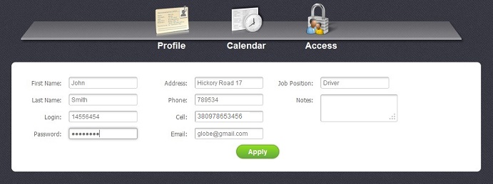 This is the main screen of the "Employees" section with the "Profile" menu opening automatically as the first one. Here you can finish adding your employees or edit the information concerning the already existing ones.