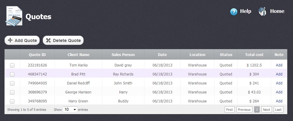This is the main screen where you can observe all the basic information about your quotes. Here you can see at once the list of your created quotes, have a look at and complete the important information concerning the quotes and clients that bear relation to them.