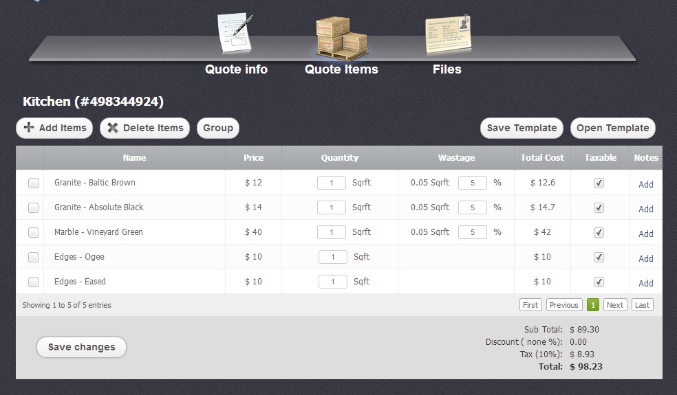 With Quote items section you can see the amount of goods and services you can deal with, add them or delete from your list.