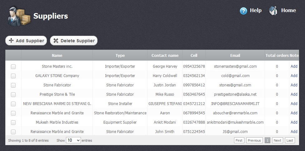 In this module you can create and edit the list of your suppliers. Add new suppliers, remove them from the list or select the already existing ones, who has registered in the system before. Besides, here you can keep the information concerning your suppliers, see their price lists and manage purchases.