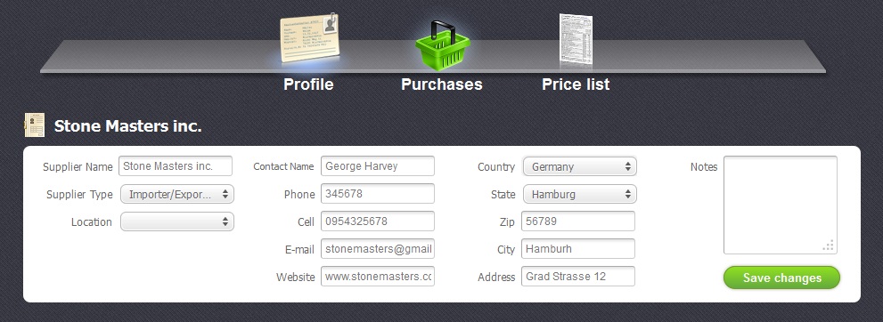 This is the main screen of the "Suppliers" section with the "Profile" menu opening automatically as the first one. Here you can finish adding your suppliers or edit the information concerning the already existing ones.