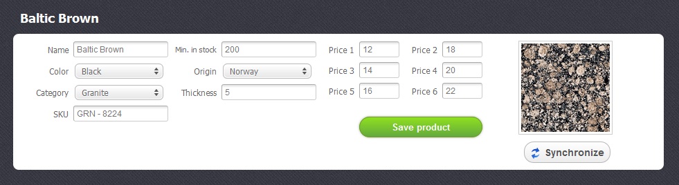 Another useful thing is "Min. in stock" field. This field will help you always to remember the amount of products in your possession at warehouse. You may set this number at once and later, if the number of required products is bigger than this, easystoneshop will give you a hint, that you do not have so many, by highlighting the desirable amount with red colour.