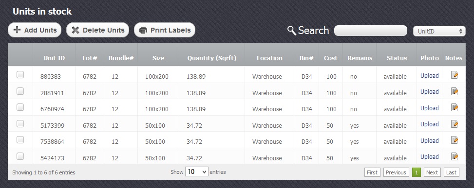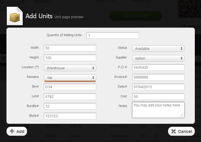 In the picture below you can see how 6 slabs were added. 3 of them are solid and 3 remnants. The differences between them can be made by means of such columns as "Unit ID", "Size" and "Cost". Actually you are the one who does it. You fill in the empty fields as it is shown in the picure above.